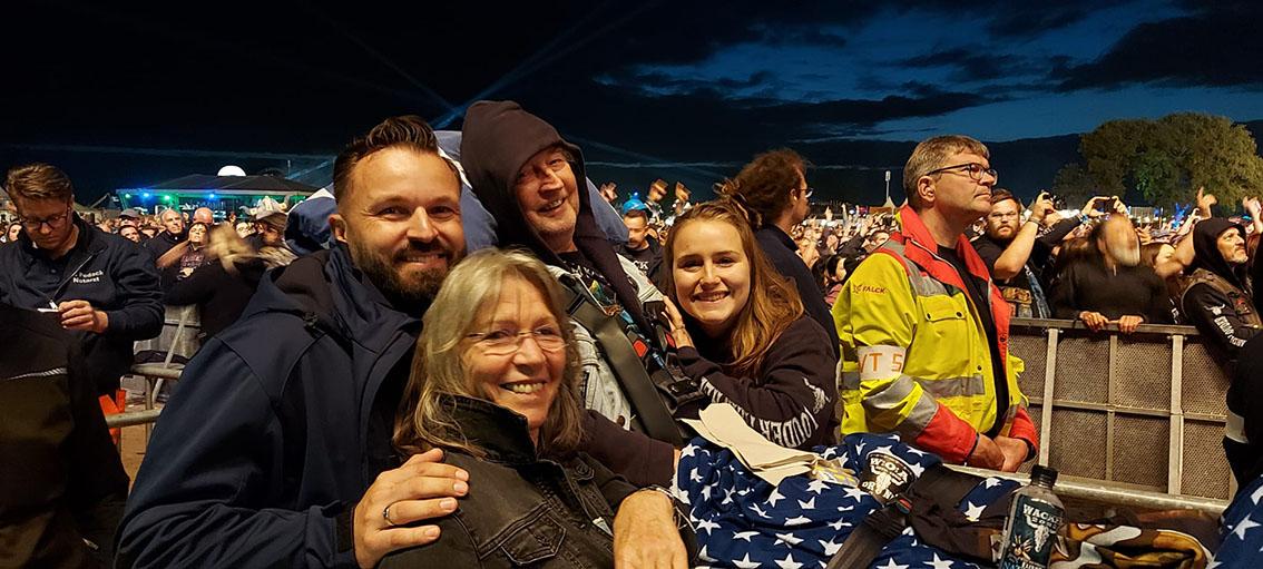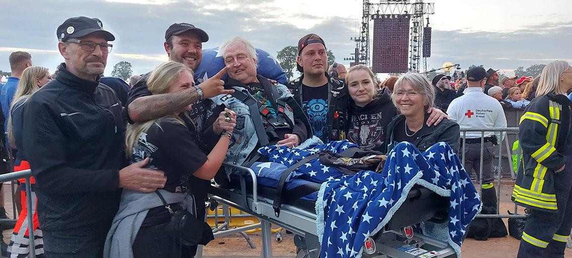 Am späten Freitagnachmittag trafen Nina und ich nun wirklich mit dem Wünschewagen bei Michael ein. Tränen der Begeisterung und Rührung flossen, so groß war die Freude, dass es jetzt doch wirklich losgehen sollte. Das beste Maiden Shirt wurde angezogen, darüber die Kutte mit den vielen Patches und Bändchen der vergangenen Wacken-Besuche. Gemütlich auf der Trage gebettet, und dann ging es los Richtung Holy Ground.
